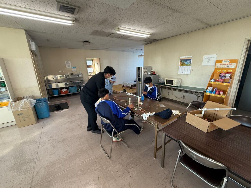 写真は電池列車を造っている写真なのですが、この2人はコイルの知識が半端ない!!電池列車をさっさと造り終えると、電線で造った輪っかをくるくる回すおもちゃを、自分で作って披露してくれました。是非将来セルコに来てください!(笑)